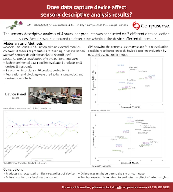 Fisher, C. M., King, S. K., Castura, J. C., & Findlay, C. J. (2015). Does a change in data capture device affect sensory descriptive analysis results? In: 11th Pangborn Sensory Science Symposium. 23-27 August. Gothenburg, Sweden.